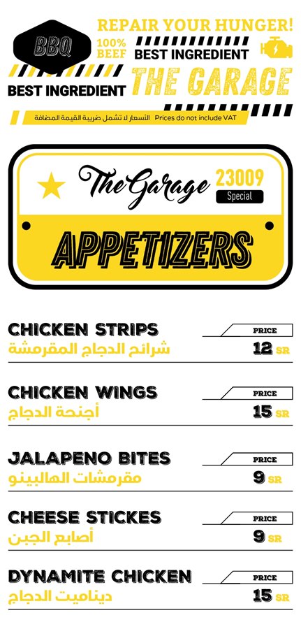 البرغر ممتاز والاسعار تعتبر منافسة مقارنة بجودة البرغر. المكان جدا متواضع ومن الاسم (كراج) راح تحس ان المحل ورشة عمل للشباب السعوديين وماشاء الله سريعين ومهنيين جدا في التحضير. لا يوجد للاسف جلسات داخليه؛ فقط جلسات خارجية محدودة وصغيرة.